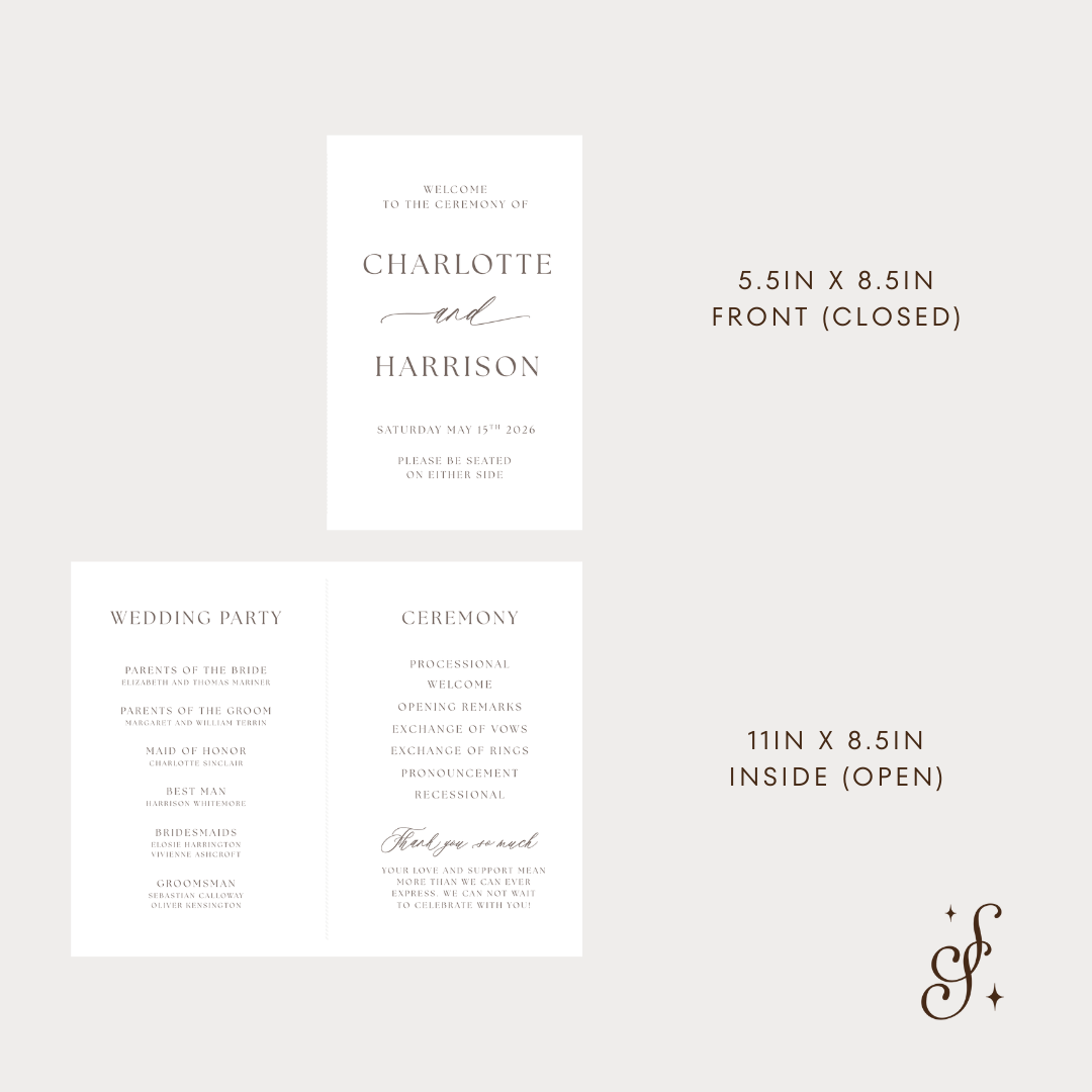 An elegant wedding program designed with refined simplicity in mind. Part of the Charlotte Collection, this editable template features clean typography, soft neutral tones, and a thoughtfully balanced layout that feels both classic and modern.