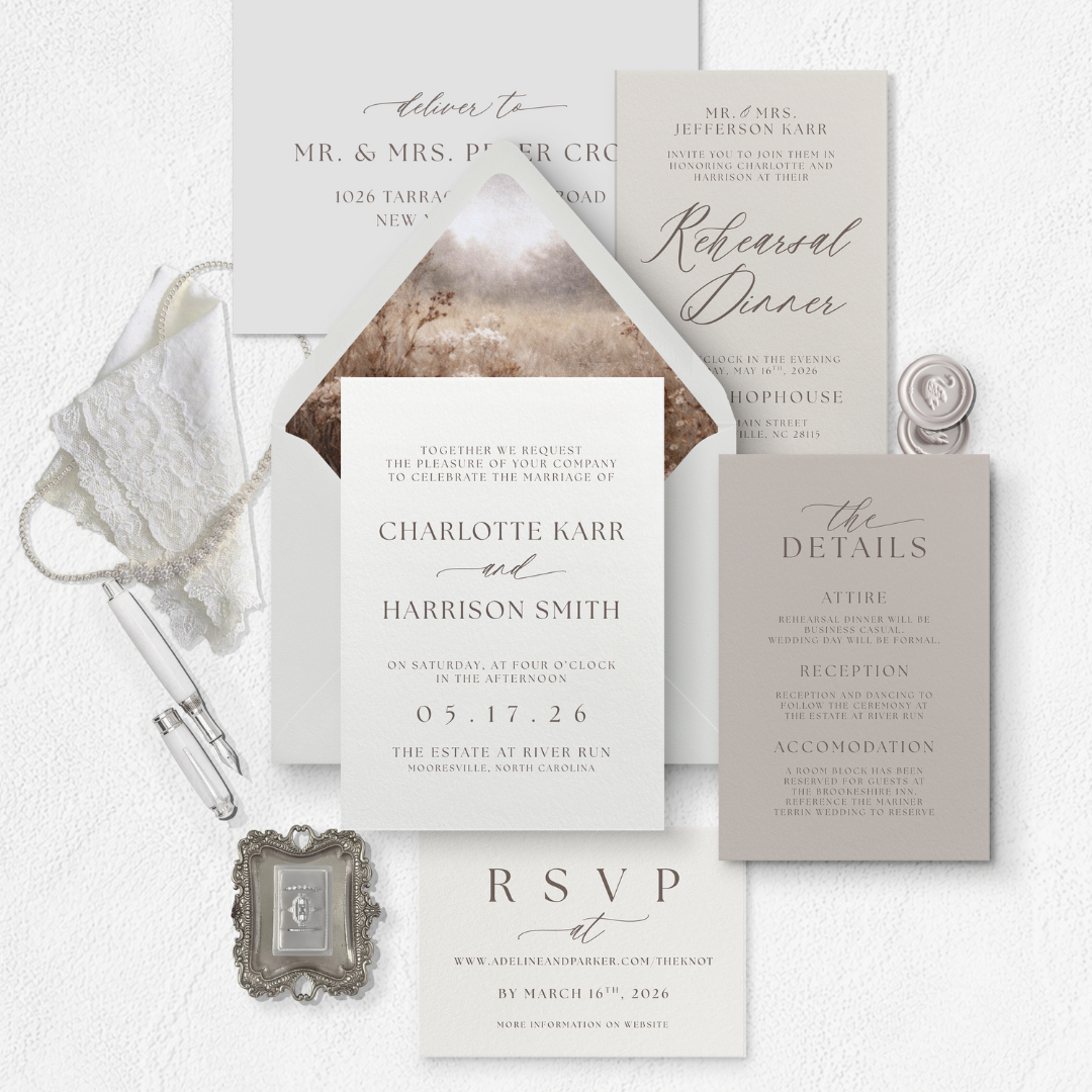 Rooted in classic design and soft, modern neutrals, the Charlotte Collection offers an elevated invitation suite with a calm, romantic presence. Thoughtfully layered and fully customizable in Canva, it’s designed to feel polished, personal, and effortlessly elegant. no design experience needed
