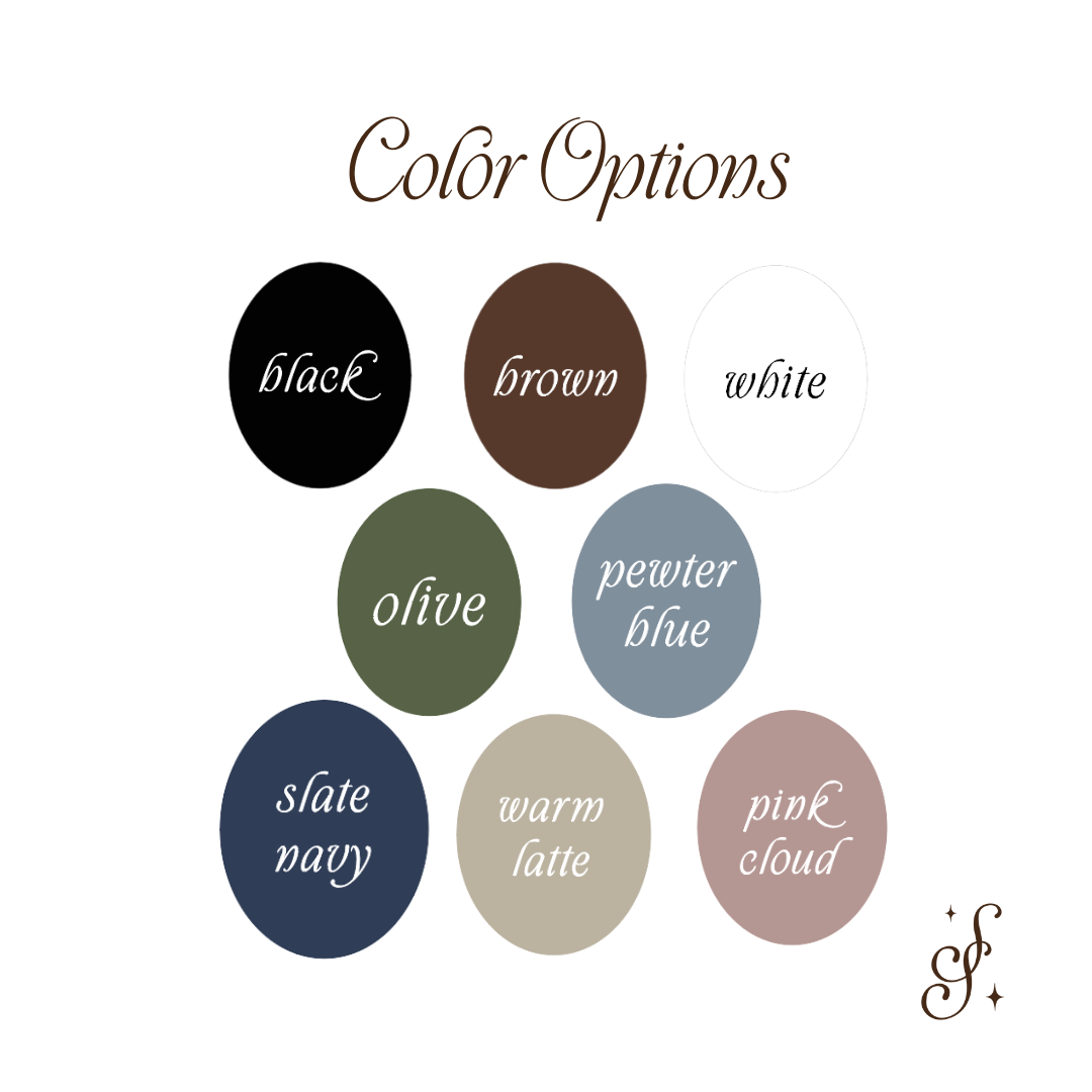 Choose your font, size, and color- type your names in at checkout. Within 48 hours a Soft Spoken Designer will reach out with a mock design prior to production