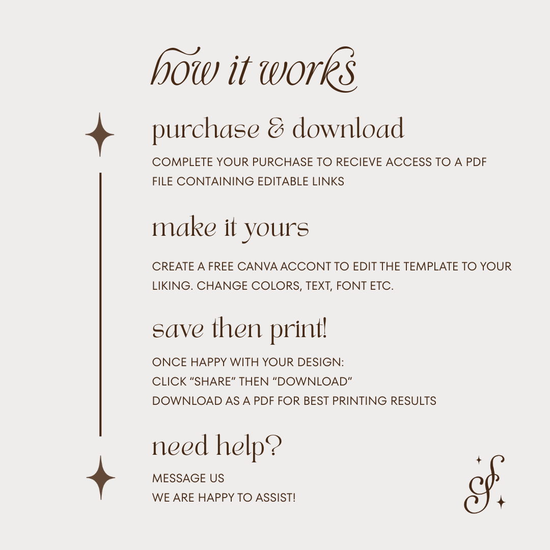 No design experience? No problem. Edit directly in Canva—just update the names, dates, and details, download, and print!