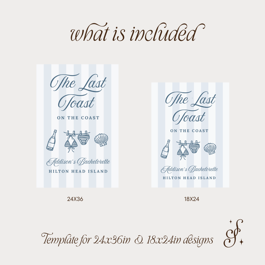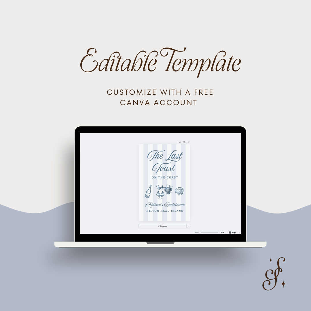 This Last Toast on the Coast Canva template is the perfect personalized welcome sign for a coastal bachelorette weekend. Featuring a chic, hand-drawn design with beachy elegance, it’s ready to be customized and printed in minutes.
