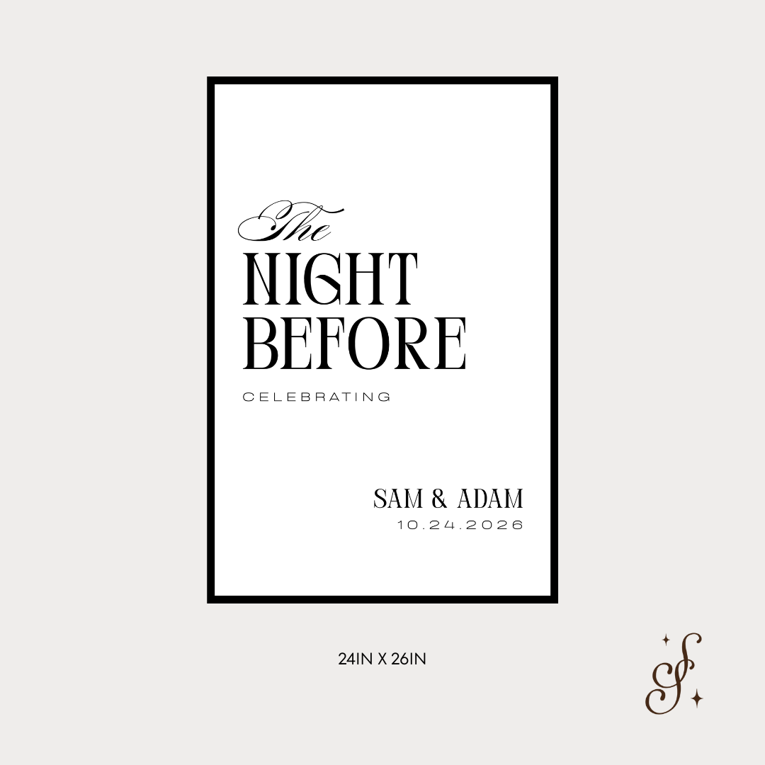 Celebrate the start of your wedding weekend with the Sloane “The Night Before” Sign. Designed in a classic black-and-white palette.